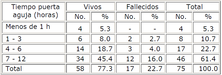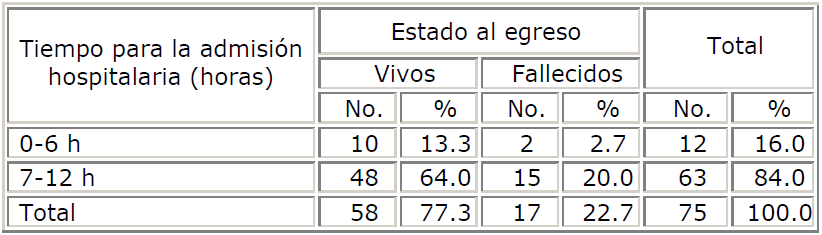 En la Tabla 3 se representa el comportamiento del tiempo transcurrido desde el inicio de los síntomas del infarto agudo del miocardio hasta la admisión hospitalaria en ambos grupos, refleja que el tiempo de admisión predominante fue de 7 a 12 horas para un 84.0 %.