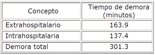 El tiempo de demora para iniciar la trombólisis en el infarto agudo del miocardio se refleja en la Tabla 4, donde existe un tiempo de demora total de 301.3 minutos, representada en extrahospitalaria de 163.9 minutos y en intrahospitalaria de 137.4 minutos.