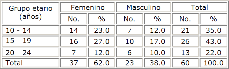 La Tabla 1 analiza la distribución de adolescentes según grupo etario y sexo donde predominó el comprendido entre 15-19 años con un total de 26 para un 43 %, siendo representativo el sexo femenino con 16 adolescentes para un 27 %.
