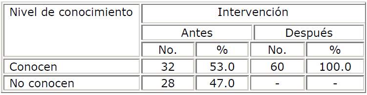 En el nivel de conocimiento de los adolescentes acerca de los factores de expresión sexual (Tabla 2), se apreció desconocimiento en 28 de los adolescentes lo que estuvo representado por el 47 % de ellos, sin embargo, después de la intervención el 100 % adquirió conocimientos de dichos factores.