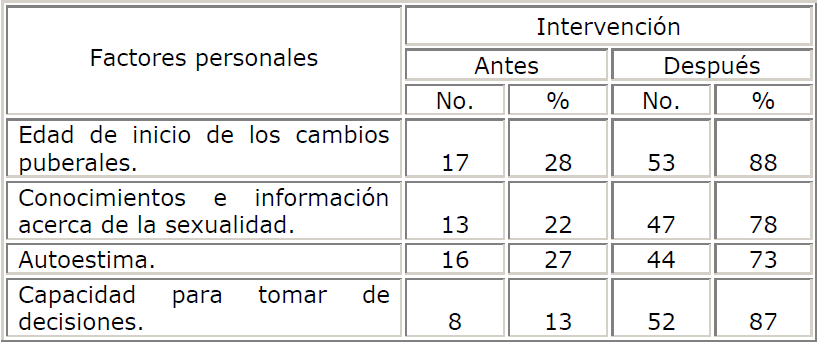 La capacidad para tomar decisiones por adolescentes es condición esencial para comportamiento de sexualidad en ellos. Se requiere personal capacitado y dispuesto a desempeñar un papel activo para promover la transformación de los adolescentes ante su actitud para enfrentar sexualidad, la baja capacidad que poseen evidencia su comportamiento como uno de los elementos que más inciden en factores personales, demuestra que falta de conocimientos del adolescente influye negativamente, lo que se revierte ante la capacitación9.