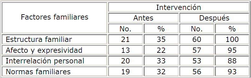 Dentro de los factores familiares el afecto y la expresividad resultó ser el menos conocido representado por 13 adolescentes para un 22 %, al intervenir 57 de 60 adolescentes para un 95 %, incrementaron sus conocimientos. (Tabla 4).