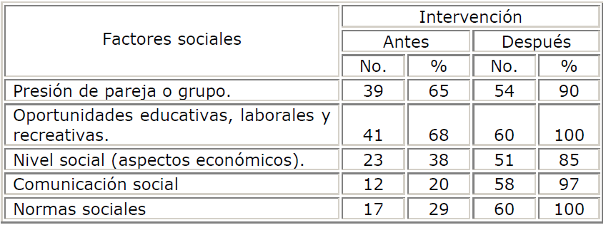 Los factores sociales repercuten negativamente en el comportamiento de adolescentes, sobre todo comunicación social, independientemente de las oportunidades educativas, laborales y recreativas, así como las normas sociales y los patrones culturales existentes. Todo esto pudiera estar influenciado por presencia de factores relacionados con el medio en que se desarrollan los jóvenes, entre ellos, el ambiente familiar y la comunidad.5,6