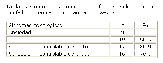 Según los estudios realizados en la identificación de los síntomas psicológicos en los pacientes con fallo de la ventilación mecánica no invasiva es evidente la ansiedad y el temor. Otros autores11,12,13 señalan que el éxito de la VAMNI suele estar limitado por la colaboración del paciente para la realización del proceder, en los que es común la aparición de temores y ansiedad. Observación similar revelan otros estudios.14,15