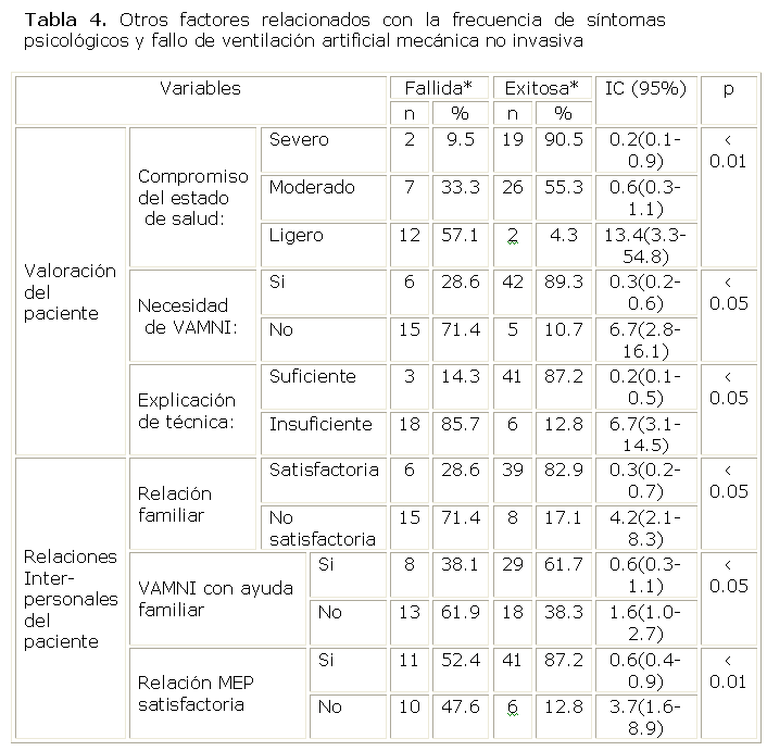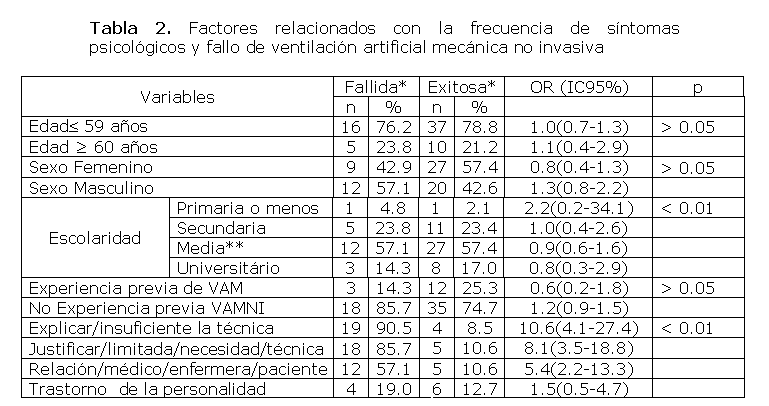 Se advierte como los síntomas psicológicos pueden determinar el éxito de la ventilación artificial mecánica no invasiva, entre estos el más común es la ansiedad. Los síntomas psicológicos que limitan el éxito de la ventilación artificial mecánica no invasiva no están determinados por la edad, el sexo y la experiencia previa del paciente con la esta terapéutica; su aparición sí se relaciona con la aptitud del enfermo ante el proceder, su criterio respecto a su enfermedad y sobre la técnica, y el logro de una relación satisfactoria con su familia y el personal médico y de enfermería; lo que reveló la necesidad de ofrecerles más información respecto a la terapéutica en cuestión.