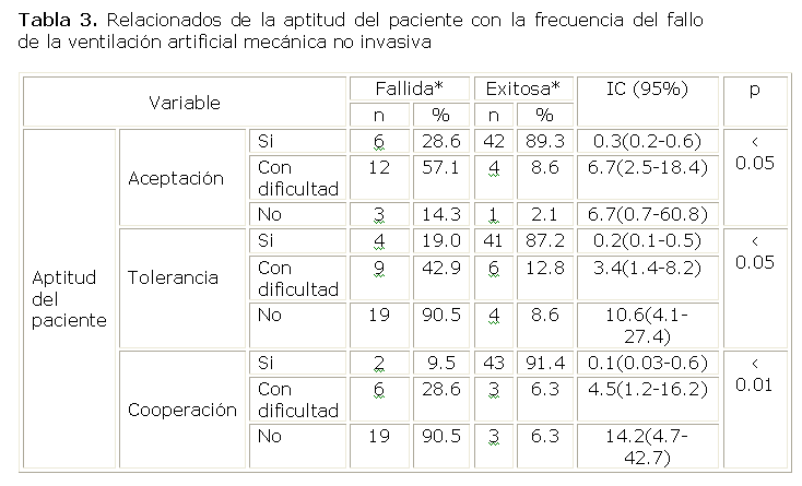 La Tabla 2 muestra que no se halló relación significativamente estadística entre la edad, sexo, y experiencia previa con VAMNI y el fallo de esta terapéutica. En ello si influyó la escolaridad del paciente, la explicación insuficiente de la técnica y su necesidad, y la limitada relación médico- enfermera-paciente.