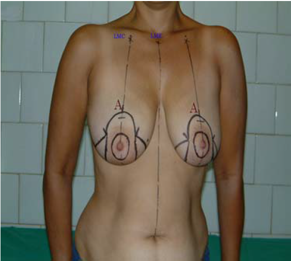 Se determina el punto A (Figura 1) sobre la línea trazada previamente entre 17- 22 cm de la horquilla esternal. Se coloca el molde de Wise sobre la línea medio clavicular a nivel del punto A, marcando el contorno para la areola, el brazo externo mide entre 5-7 cm acorde al volumen de la mama (Punto C).