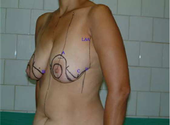 Se marca un punto en la parte más externa del surco submamario 2 cm por encima de esta y por dentro de la línea axilar anterior (Punto D) desde este punto se traza una línea hasta el Punto B.