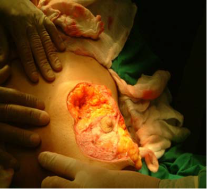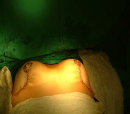 Paciente bajo anestesia (general, peridural alta, o local12 con sedación). Incisión de la piel siguiendo líneas previamente marcadas. Desepitelización del colgajo bipediculado vertical.