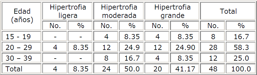 Ambos grupos están constituidos por pacientes en etapa reproductiva. Predominando las hipertrofias mamarias moderadas en 24 casos (50%), seguidos de las grandes hipertrofias con 20 pacientes.