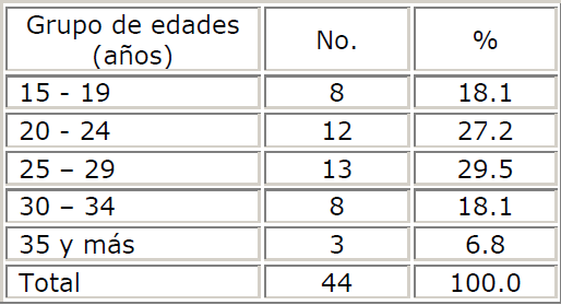 La edad de la mujer constituye un factor fundamental relacionado con el riesgo materno tanto en las edades inferiores a 20 años y particularmente por debajo de 15, como en las mayores de 35 años. En este estudio se encontró predominio del grupo de 25 a 29 años lo que representa el 29.5 % de las pacientes ingresadas seguido del grupo de 20 a 24 años con 12 de ellas para un 27.2 % (Tabla 1).