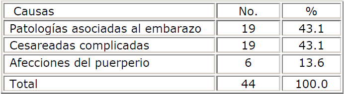 En bibliografías revisadas señalan las patologías asociadas al embarazo como causas de complicaciones tanto para la madre como para el neonato. Con relación a las cesareadas, la atonía uterina, los accidentes operatorios y las sepsis son causas frecuentes de admisiones en este servicio.5,8,9