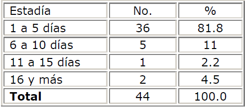 En esta investigación prevalece una estadía entre 1-5 días en 36 casos para un 81.1 %, seguido de las pacientes que estuvieron de 6-10 días en el servicio para el 11 %.