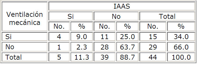 De la totalidad de pacientes 15 recibieron ventilación asistida para un 34 % y se diagnosticaron 5 infecciones asociadas a la asistencia sanitaria para un 11.3 % (Tabla 4).