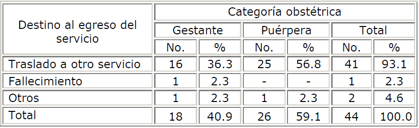 Cuando se analizan los destinos al egreso de la UCI, el 93.1 % de las pacientes fueron trasladadas a otros servicios como está protocolizado (Tabla 5) predominó el traslado al servicio de perinatología.