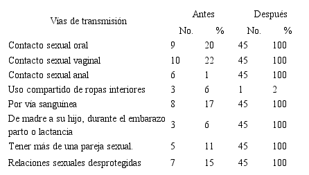 En estudios realizados en Santiago de Cuba por los autoresBouza Plasencia e Infante García [en sus tesis de terminación de residencia en el 2002] para determinar el conocimiento acerca de las ITS en adolescentes y jóvenes encontraron que el conocimiento sobre cómo se adquieren o se trasmiten estas infecciones es de suma importancia, ya que esto permite evitar la cadena de transmisión y nos permite protegernos para evitar padecerlas, conociendo que lavía más frecuente es la sexual, aunque existen otras no menos importantes como las transfusiones de sangre y por medio de la placenta. El uso correcto del condón masculino, es el único método capaz de disminuir el riesgo de transmisión de infecciones de transmisión sexual.10-12