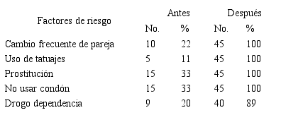 Al indagar sobre el conocimiento de los factores de riesgo relacionados con la trichomonosis vaginal (Tabla 3) se evidenció que no reconocían los riesgos para la transmisión de la enfermedad. Al culminar el estudio se hubo un incremento en el nivel de conocimiento. Cabe señalar que solamente el 11 % del total respondió inadecuadamente.
