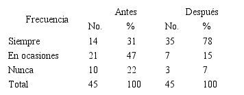 De los estudiantes encuestados el 47 % responde que el uso del condón es de forma ocasional y 31 % responde que siempre utiliza el condón, después de la intervención él 78 % utiliza el codón con frecuencia, equivalente a siempre, y solo el 15 % mantiene en ocasiones.