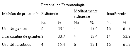 Al analizar el conocimiento de la información sobre las normas de Bioseguridad relacionadas con el personal estomatológico (Tabla 1), se obtuvieron los resultados siguientes: referente a las normas de protección personal el 61.5 %, el 53.8 % y 61.5 % se ubica en la evaluación de insuficiente, con respecto a las variables de cuando utilizar, intercambiar los guantes y cuando usar el nasobuco respectivamente.