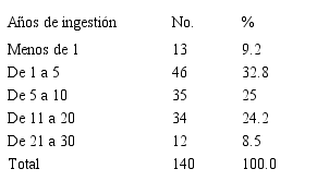 Al estudiar el tiempo de ingestión de alcohol (Tabla 1) entre los alcohólicos, resulta que el mayor grupo con el 32.8 % se incluyen entre 1 y 5 años seguidos por 25 % entre 5 y 10 años, relacionado al tiempo de ingestión de alcohol, aparece como resultado que entre los diagnósticos nosológicos el síndrome de Dependencia ocupa un 62.8 % en tanto 37.2 % se diagnostican como consumo perjudicial.