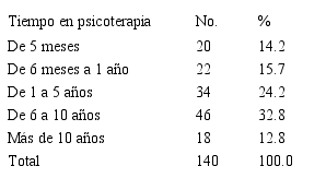 De la totalidad de la muestra estudiada, en el análisis del tiempo en psicoterapia, se reporta un 32.8 % entre 6 a 10 años, y le sigue el grupo de 1 año a 5 años con el 24.2 %. Estos resultados se corroboran con otros estudios. (Tabla 2).