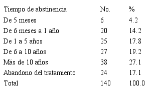 En relación con el tiempo de abstinencia obtenido, se reporta que el mayor % es del grupo de más de 10 años los cuales lograron separarse del alcohol resultando alentador; al respecto se ha expresado que a pesar de que la abstinencia es el resultado más buscado y es de elección, las reducciones del consumo pueden de todas formas reducir la morbilidad relacionada con el alcohol. Los autores consideran que solo la abstinencia total y mantenida ante el alcohol, representa la piedra angular en la deshabituación total.5 En esto coincide con otros autores. En la investigación fue posible constatar que las recaídas y el abandono del tratamiento, representan elementos a tener en cuenta en el abordaje del alcoholismo, que entorpecen la evolución y pronóstico, para lo cual deben estar preparados terapeutas, familiares y pacientes10, coincidiendo con estudios de otros autores del país.