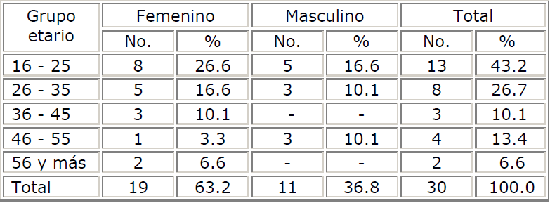 La edad de más predominio fue la comprendida entre los 16 y 25 años con 13 casos (43.2 %), el sexo femenino fue mayoritario (Tabla 1).