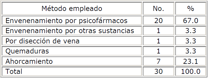Al analizar el método empleado se evidencia que prevalece el envenenamiento por psicofármacos, seguido del ahorcamiento. Los hombres tienen tendencias a utilizar los métodos violentos con más frecuencia que las mujeres.