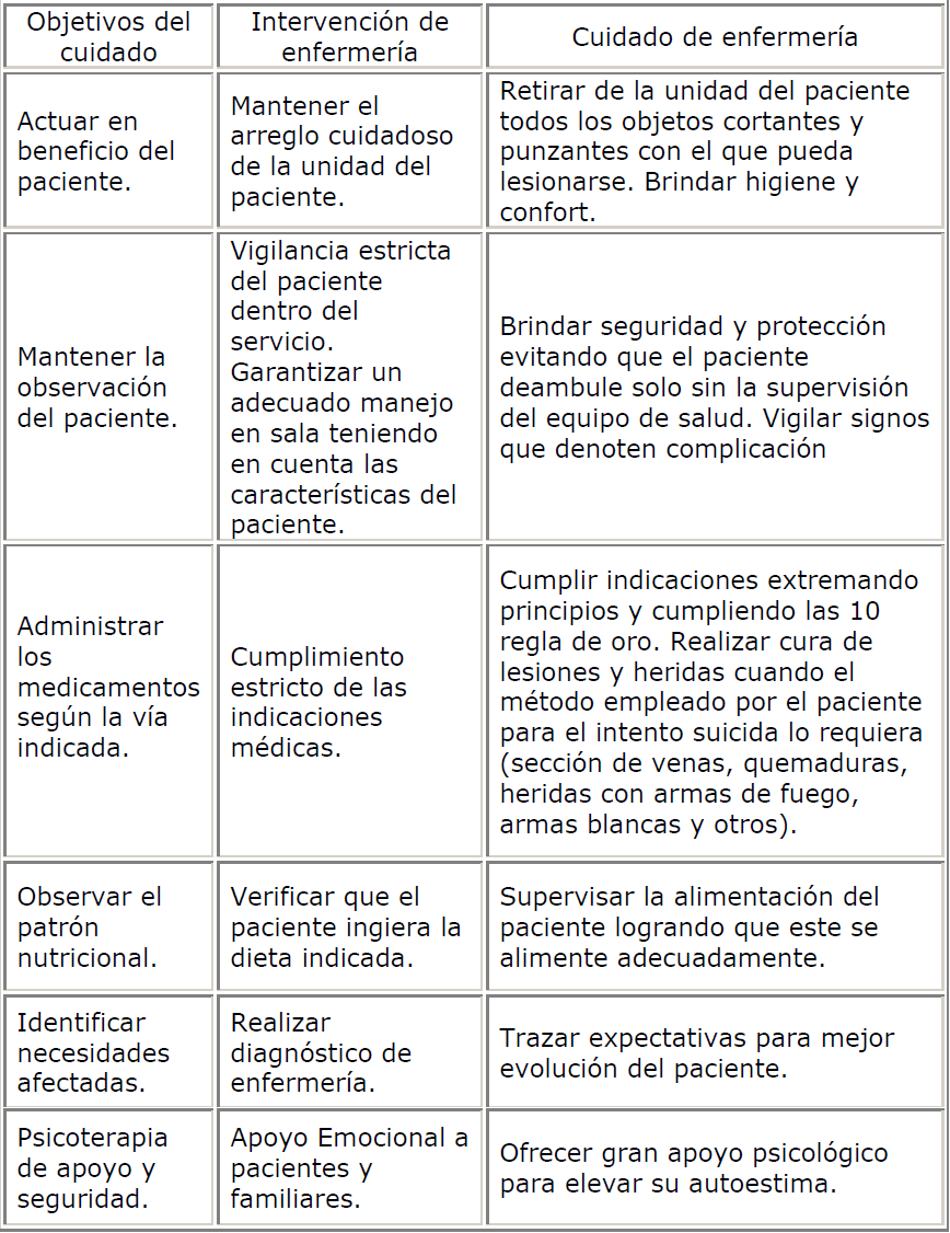 El predominio de las edades comprendidas entre la adolescencia y la juventud fueron datos relevantes en esta investigación, prevaleciendo el sexo femenino, el método que más se utilizó para realizar el intento suicida fue la ingestión de psicofármacos, los cuidados aplicados a estos pacientes y los conocimientos adquiridos después de realizar esta investigación fueron satisfactorios para todo el personal de enfermería y del equipo de salud mental.