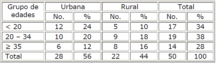 En el primer grupo etario el 42.85 % procedían del área urbana mientras que el 22.72 % del área rural. En el otro grupo el 35 % fue del área urbana y el 40.90 % de la rural y en el grupo de añosas el 21.42 % era del área urbana mientras que el 36.36 % del área rural.