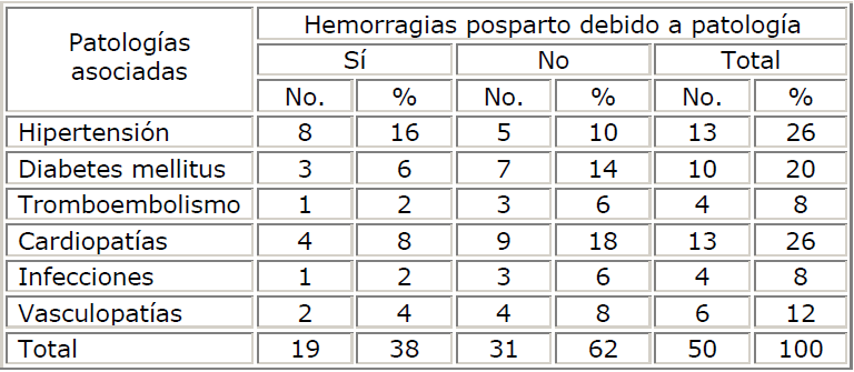 En la Tabla 2 se observa la relación existente entre las patologías postparto que presentó la mujer y su posible relación con hemorragias.