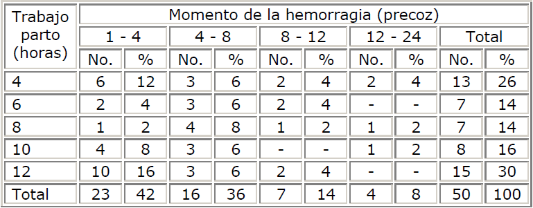 Cuando el parto se produce en cuatro horas o menos, puede aparecer la hemorragia precoz por la desarmonía rápida entre continente y contenido.14Otras investigaciones comenzaron a percibir resultados a partir de las 2 horas, lo que se corresponde con este estudio.15