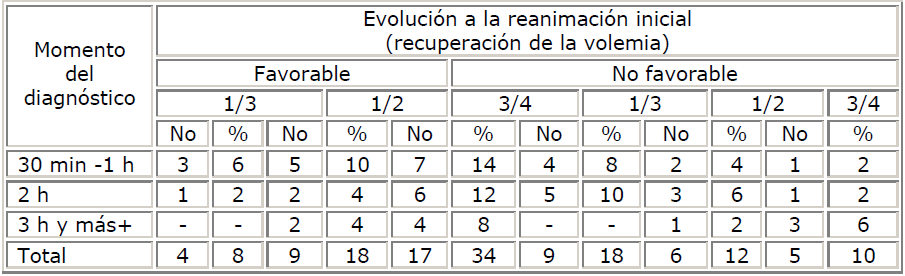 En la Tabla 4 se mostró la relación entre el momento de diagnóstico y la evolución de reanimación según tiempo de recuperación de la volemia.