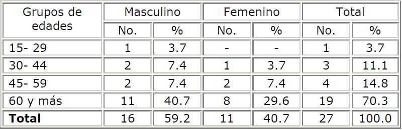 En la Tabla 1, infección según los grupos etarios y sexo, se observó que de los 27 pacientes que adquirieron NAV, hubo predominio de mayores de 60 años 19 (70.3 %). Siendo el mayor número de casos del sexo masculino con 16 pacientes (59.2 %).