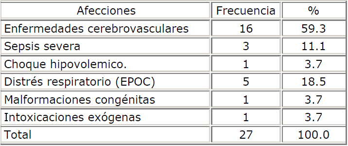 De las enfermedades de base por lo cual se indicó ventilación mecánica artificia, las enfermedades cerebrovasculares fueron las más representativas con 16 pacientes (59.3 %) (Tabla 2).