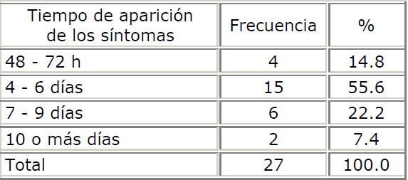 En la Tabla 3, los síntomas aparecieron en su mayoría entre 4-6 días con un 55.5 %.