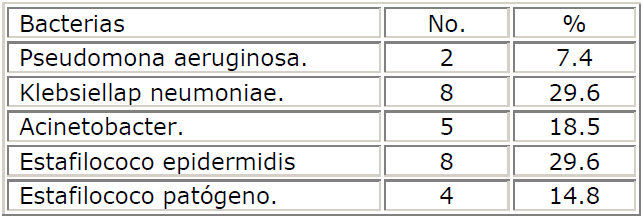 En la Tabla 4 a pesar de que, entre los resultados microbiológicos, predomina Estafilococo epidermidis conjuntamente con la Klebsiella, representando el 29.6 %; de forma general, se obtuvo mayor aislamiento de gérmenes Gram negativo de 15 (55.5 %).