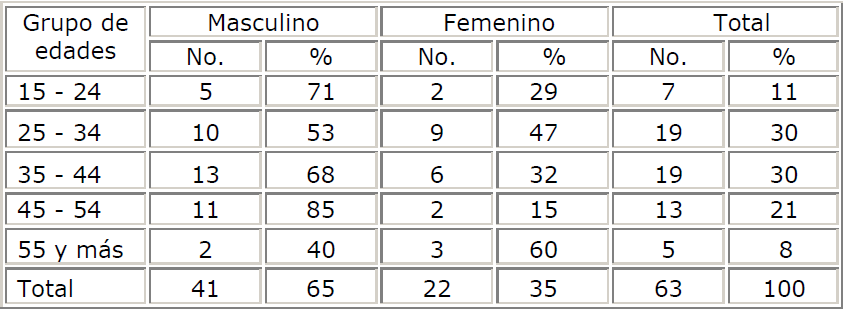 Estos resultados guardan relación con otras investigaciones5,6 donde predominó el grupo etario 19 a 34 años, pero con mayor afectación del sexo femenino.