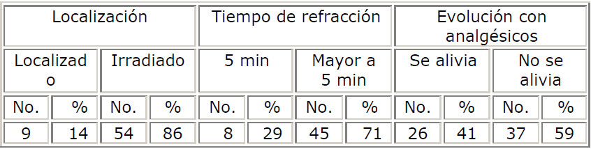En el 71 % de los pacientes el dolor persistió por más de 5 minutos tras cesar el estímulo desencadenante. El 29 % refirió un tiempo de refracción no mayor de cinco minutos. El 59 % de los pacientes no refirió alivio del dolor con la ingestión de analgésicos o antinflamatorios.