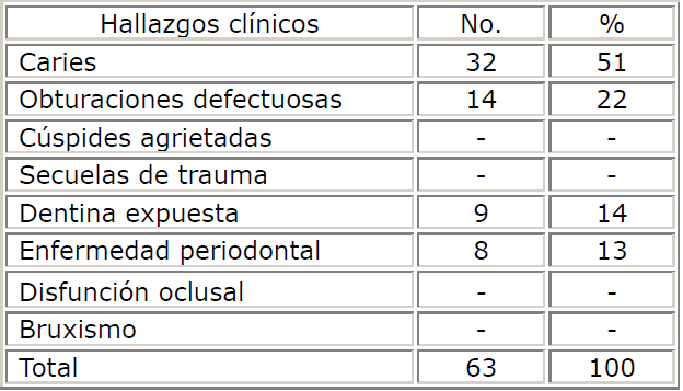 El 33 % refirió dolor moderado y el 8 %, un dolor leve, de corta duración, fundamentalmente durante la masticación.