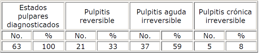 El 59 % de los estados inflamatorios diagnosticados se correspondió con la pulpitis aguda irreversible (Tabla 5), seguido de la pulpitis reversible (33 %) y por último la pulpitis crónica irreversible (8 %).