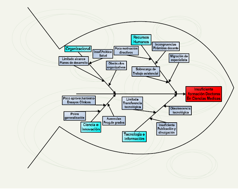 Estos mismos fueron llevados al diagrama causa-efecto (diagrama de Ishikawa) (Gráfico 1) consignándose como principales causas lo organizacional, los recursos humanos y financieros, las deficiencias tecnológicas e informáticas y lo relacionado con las insuficiencias en las categorías docentes y científicas con sus diferentes subcausas, siendo la de mayor peso con el 20.7 % la falta de motivación de los directivos para hacer el doctorado.