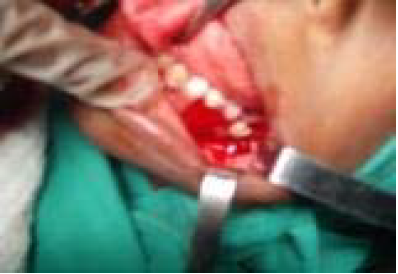 Se coloca Coralina en cavidad ósea. Se toma muestra para Biopsia, se sutura con seda negra 2/0 (Figura 4).