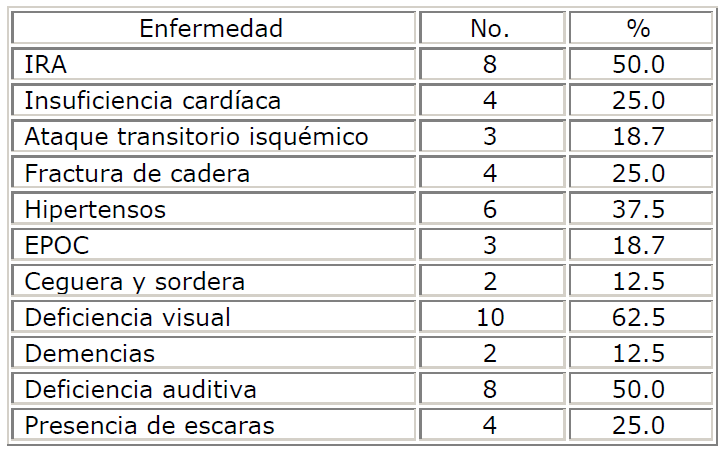 La Tabla 1 muestra que los principales problemas médicos encontrados fueron las deficiencias visuales (62.5 %), las auditivas (50 %) y las insuficiencias respiratorias agudas (IRA) con el 50 %.