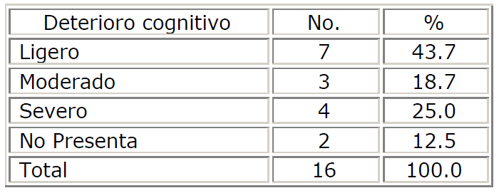 Igual resultado se obtuvo en el estudio realizado11 por la Dra Adria del Carmen en la misma área salud en mayo del 2013, le siguen la hipertensión arterial en estadios I y II con el 37.5 %, insuficiencias cardíacas congestivas por cardioesclerosis, fracturas de cadera que ya son antiguas, han recibido tratamiento quirúrgico y adecuada rehabilitación, con el 25 %, lo que provoca trastorno del equilibrio y de la movilidad con presencia de escaras, que afectan la independencia del anciano; conllevándolo a un estado de postración a largo o corto plazo, la mayoría se encuentran con algún grado de deterioro cognitivo, con predominio del ligero, por lo que son personas que necesitan supervisión y cuidados constantes en todas las actividades que realizan, existiendo una diferencia notable con el estudio realizado en Barbados 2016, donde predominaba el deterioro severo.