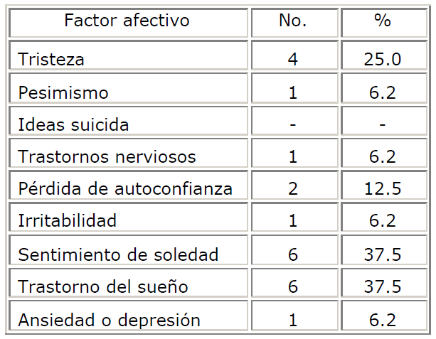 Los factores afectivos de mayor riesgo en los centenarios resultaron ser el sentimiento de soledad y el trastorno del sueño con el 37.5% (Tabla 3).