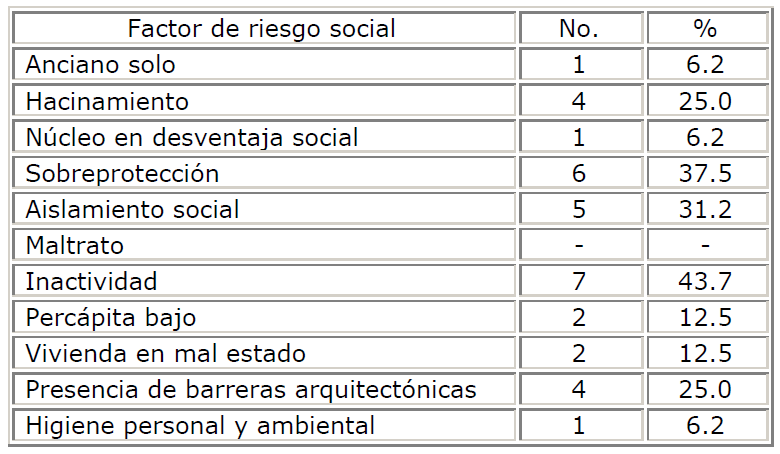 Los problemas sociales que más los afectan son la inactividad (43.7 %), lo cual se acompaña de sobreprotección por parte de los cuidadores que limita la autonomía y disminuye la autoestima (37.5 %), lo que permite que el aislamiento social se encuentre en un 31.2 % y la presencia de barreras arquitectónicas dentro de los hogares con hacinamiento provocándoles caídas frecuentes (25 %).