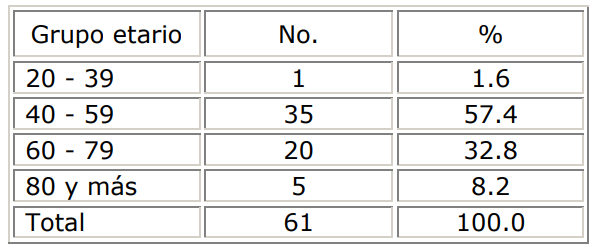 La Tabla 1 muestra la distribución de las pacientes con cáncer cervicouterino según grupo etario, se observó un predominio del grupo comprendido en las edades de 40-59 años, guardando relación en que en esta edad existe mayor riesgo de padecer la enfermedad y la poca percepción del riesgo existente en la población en general, la menor incidencia apareció en el grupo etario de 20-39 años.