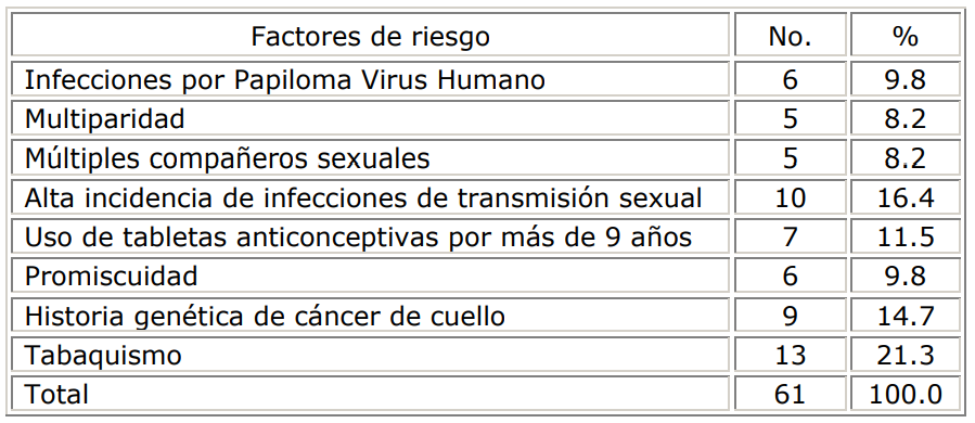 La edad que prevaleció fue el grupo comprendido entre 40-59. Los factores de riesgo de más importancia fueron el hábito de fumar y la alta incidencia de infecciones de transmisión sexual. Se demostró que el mayor porcentaje de mujeres tenía conocimientos sobre la frecuencia de la realización de la prueba citológica.