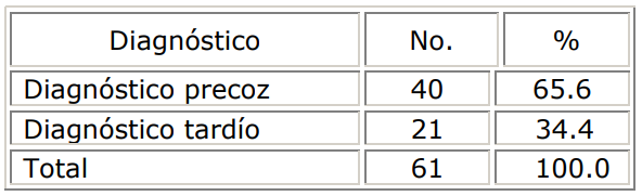 La Tabla 3 está relacionada con el diagnóstico de la enfermedad obteniendo que el 65.6 % de las pacientes fueron diagnosticadas precozmente lo que demuestra que la población femenina tiene conocimientos básicos sobre la importancia de la realización de la prueba citológica, aunque se considera que aún no son suficientes por lo que un 34.4% fue diagnosticada en una etapa avanzada.